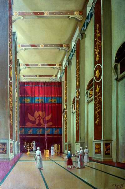 Alors qu’ils étaient dans le désert, les enfants d’lsraêl reçurent l’injonction suivante “Et ils me construiront un sanctuaire pour que je réside au milieu d’eux” - Exode 25,8. Ce tabernacle mobile et précaire (Michkane) abritant l’Arche d’Alliance dura 440 ans jusqu’à la construction du Temple de Jérusalem par Salomon d’après les instructions de son père le Roi David. Pour l’essentiel, ce Temple était identique au Tabernacle du désert dans son agencement et sa structure, mais était construit dans des proportions importantes et Salomon multiplia le nombre d’ustensiles consacrés en fonction des besoins d’Israël. Il fit également fabriquer des ustensiles propres à ce Temple. Le Temple construit par Salomon en 950 avant notre ère (date hébraïque 2 953) sera détruit par Nabuchodonosor, Roi de Babylonie, en 586 avant notre ère (date hébraïque 2 519) L’office du Temple fut rétabli en 167 avant notre ère (date Hébraïque 2 168) et il fut, aux dires de l’époque, “le plus beau monument du monde”. |
